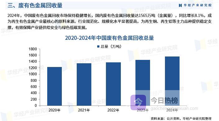 2024年,中国废有色金属回收市场保持稳健增长,国内废有色金属回收量达1565万吨(金属量),同比增长8.1%,成为再生有色金属产业最核心的原料来源。行业规范化、规模化水平显著提高,为再生铜、再生铝等主力品种提供稳定支撑,有效保障产业链供给安全与绿色低碳发展。
