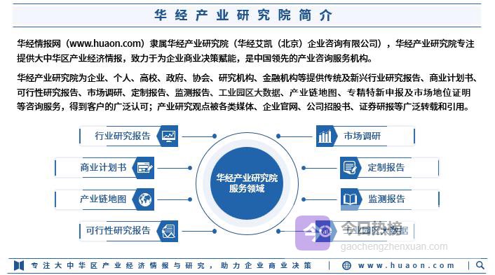 华经情报网隶属于华经产业研究院,专注大中华区产业经济情报及研究,目前主要提供的产品和服务包括传统及新兴行业研究、商业计划书、可行性研究、市场调研、专题报告、定制报告、工业园区大数据、产业链地图、专精特新申报、小巨人申报、市场地位证明等。涵盖文化体育、物流旅游、健康养老、生物医药、能源化工、装备制造、汽车电子等领域,还深入研究智慧城市、智慧生活、智慧制造、新能源、新材料、新消费、新金融、人工智能、“互联网+”等新兴领域。