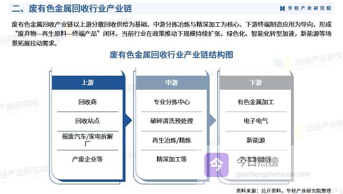废有色金属回收产业链以上游分散回收供给为基础、中游分拣冶炼与精深加工为核心、下游终端制造应用为导向,形成“废弃物—再生原料—终端产品”闭环。当前行业在政策推动下规模持续扩张,绿色化、智能化转型加速,新能源等场景拓展拉动需求。