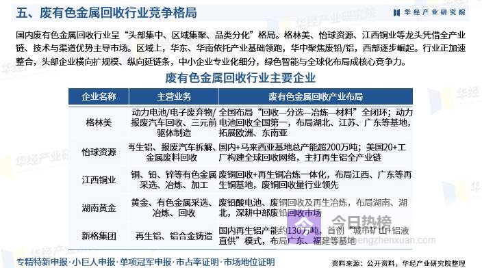 国内废有色金属回收行业呈“头部集中、区域集聚、品类分化”格局。格林美、怡球资源、江西铜业等龙头凭借全产业链、技术与渠道优势主导市场。区域上,华东、华南依托产业基础领跑,华中聚焦废铅/铝,西部逐步崛起。行业正加速整合,头部企业横向扩规模、纵向延链条,中小企业专业化细分,绿色智能与全球化布局成核心竞争力。