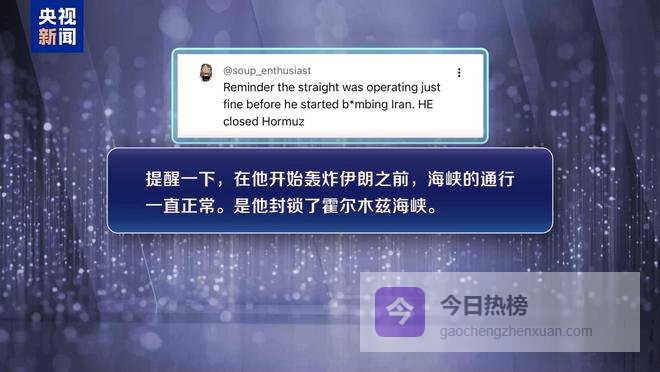 还有网友评论道,“提醒一下,在他开始轰炸伊朗之前,海峡的通行一直正常。是他封锁了霍尔木兹海峡。”