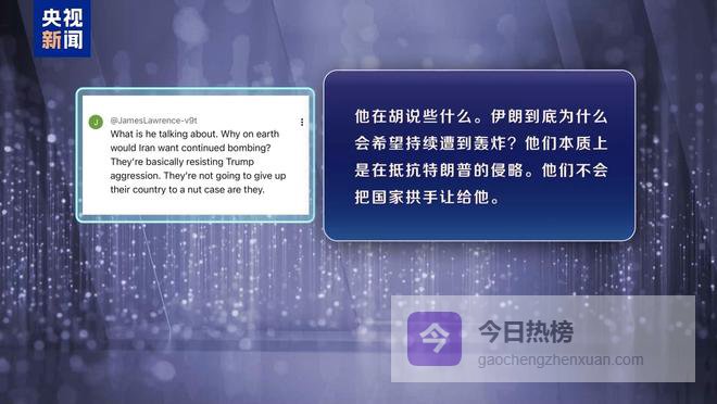 “他在胡说些什么。伊朗到底为什么会希望持续遭到轰炸?他们本质上是在抵抗特朗普的侵略。他们不会把国家拱手让给他。”