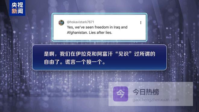 针对此番言论,有网友犀利地评论道:“是啊,我们在伊拉克和阿富汗‘见识’过所谓的自由了。谎言一个接一个。”