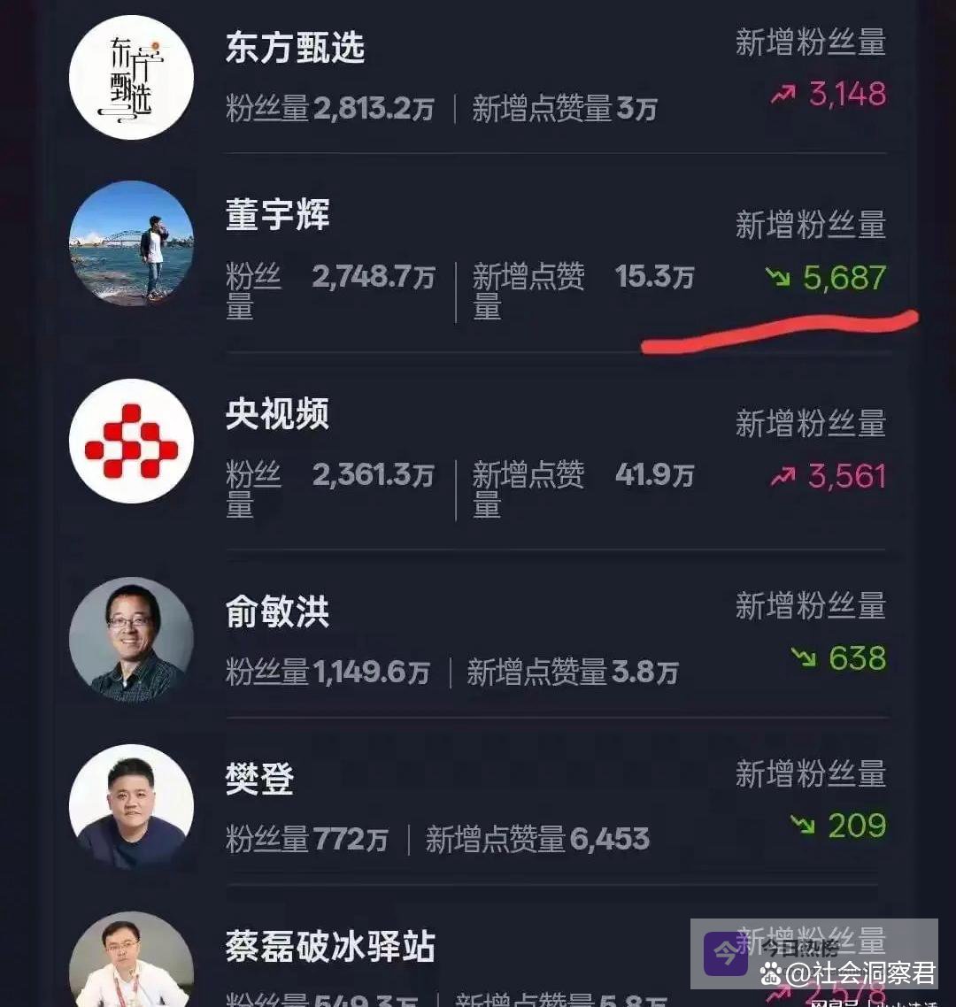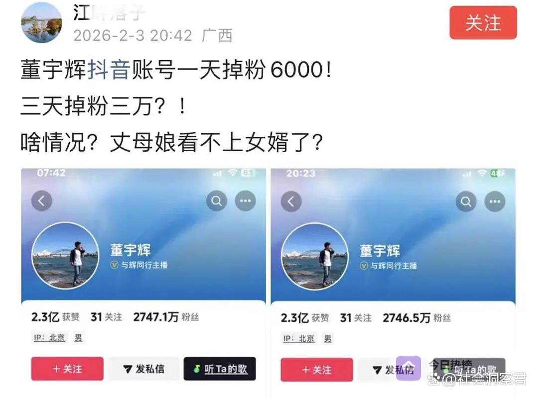 近日有网友发帖称,董宇辉抖音账号一天掉粉6000!三天掉粉三万?!啥情况?丈母娘看不上女婿了?