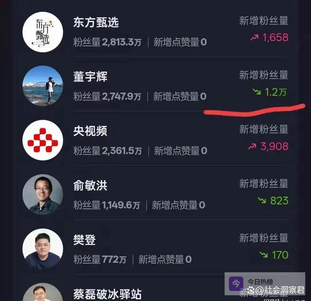 这两天的直播圈,气氛有点诡异。曾经的“国民女婿”董宇辉,数据面板突然泛起了绿光。少则一天五六千,多则破万,掉粉趋势像刹车失灵的卡车,大有不可遏制之势。