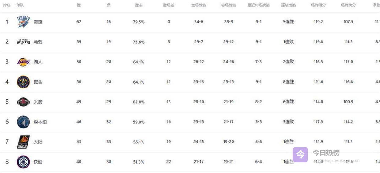 火箭队目前以49胜29负的战绩排在西部第五位。 他们距离西部第四的丹佛掘金和第三的洛杉矶湖人,都只有一个胜场的差距。 在常规赛还剩最后几场的情况下,火箭冲击西部前三的可能性依然存在。 球队近期状态不错,已经取得了一波连胜。 根据网络数据显示,火箭本赛季场均能得到114.1分,失分110.2分,净胜分达到+3.9。 他们的前场篮板率高达38.9%,排名联盟第一,篮板率54.5%同样是联盟榜首。 这些数据支撑着他们稳固的西部前六位置。