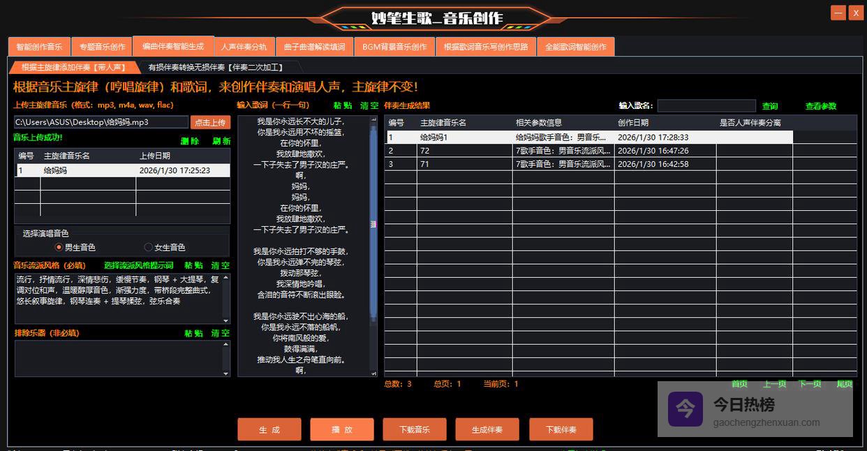 《妙笔生歌》作为一款国产优秀的AI智能创作音乐软件,宛如音乐创作领域的一颗璀璨新星,全方位助力原创音乐人快速高质量创作歌曲。它具备的AI编曲作曲功能,就像是一位不知疲倦的音乐助手,能根据音乐人输入的简单指令,迅速生成符合要求的旋律和节奏,为创作节省大量时间。对于那些有清唱哼唱主旋律却缺乏合适伴奏的音乐人来说,它的AI给清唱哼唱的主旋律作伴奏功能堪称福音,能精准匹配旋律风格,生成相得益彰的伴奏。