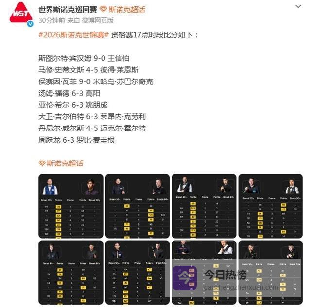 北京时间4月11日,2026年斯诺克世锦赛进入资格赛第六比赛日争夺,在率先结束的第一时段各场比赛中,18岁中国小将王信伯被打出惨案,面对世界冠军宾汉姆狂输了一个0-9!此外,15岁的波兰神童苏巴尔奇克同样挂蛋,连丢九局以0-9落后于瓦菲!其余场次,周跃龙6-3麦圭根,汤姆福德6-3高阳,吉尔伯特6-3克劳利,亚伦希尔6-3姚朋成,迈克尔霍尔特5-4丹尼尔威尔斯,彼得莱恩斯5-4马修史蒂文斯。根据赛程安排,以上各场比赛的第二阶段决战将会在次日凌晨2点继续。