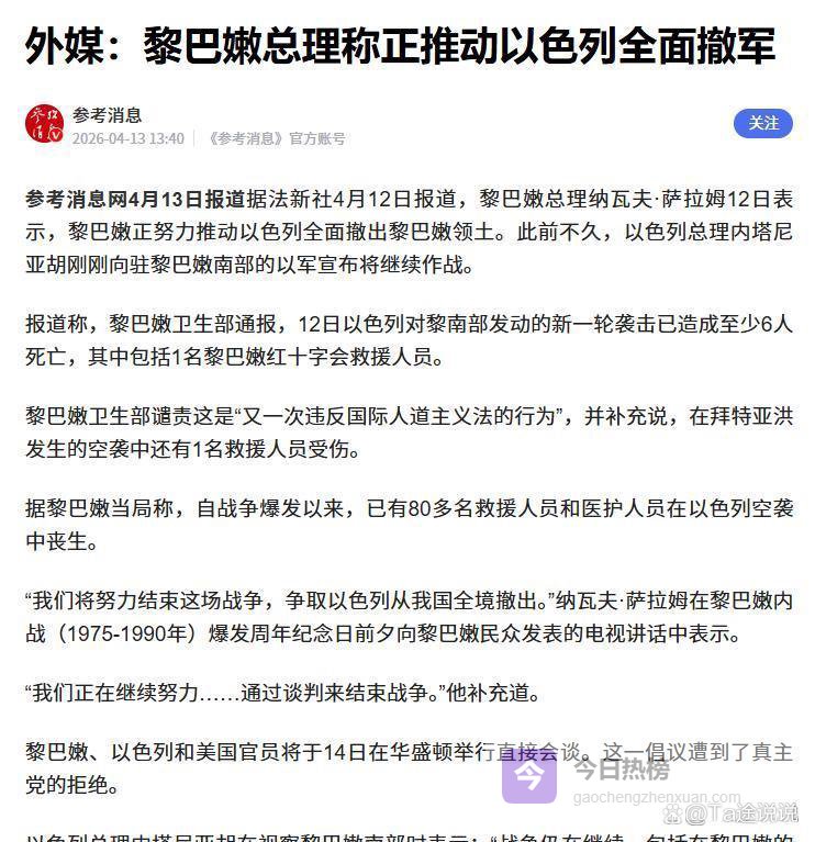 黎巴嫩要撤军、停火,以色列要继续打、建缓冲区,这立场根本对不上,可美国偏偏跳出来,说4月14号要在华盛顿搞三方会谈。