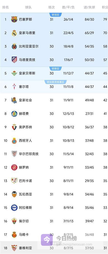 本轮比赛前,巴萨少赛一场领先皇马6分。 但在巴萨4-1战胜西班牙人、皇马1-1战平赫罗纳之后,积分榜形势彻底明朗。 巴萨31轮积79分,皇马30轮积70分。 巴萨对皇马的领先优势扩大到了9分,而且巴萨还少赛一场。