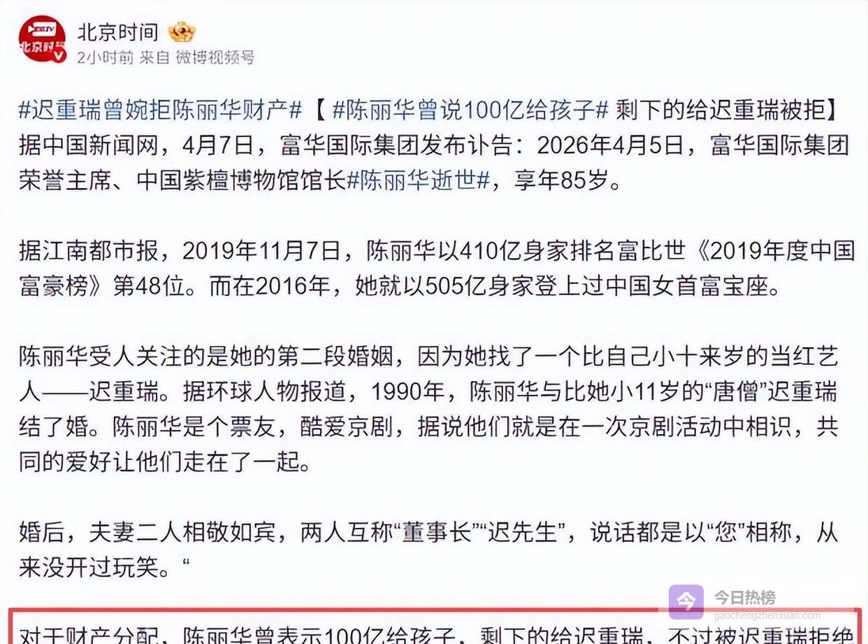 陈丽华曾表示打算把上百亿的资产分给和前夫的三个孩子,剩下的几百亿留给迟重瑞。
