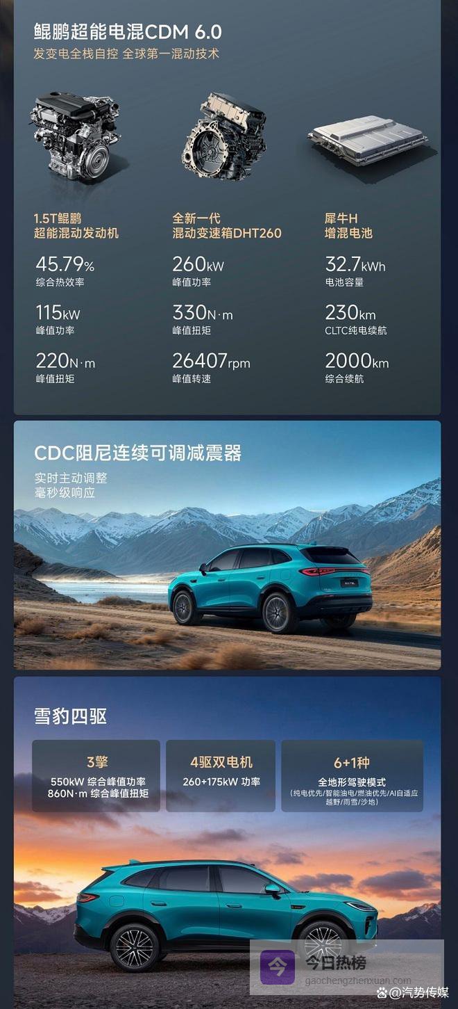 动力方面,奇瑞风云T9L搭载鲲鹏超能混动CDM6.0系统,入门版采用1.5L发动机+160kW电机+DHT160变速箱的组合,综合最大功率242kW;其他版本搭载1.5T发动机+260kW电机+DHT260变速箱的组合,综合最大功率375kW。CLTC纯电动续航分别为135km和230km,综合续航里程实测超过了2000公里。