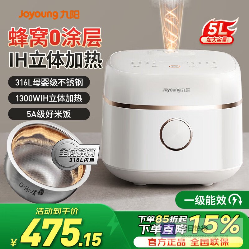 九阳(Joyoung)时尚电饭煲0涂层1代一级能效IH立体加热5升316L不锈钢无涂层球釜4-5-8人家用蒸煮炖一体电饭锅 【全域蜂窝0涂层】50F560L大容量柴火饭 5L¥
