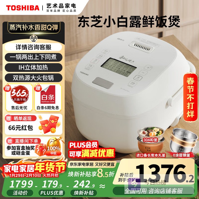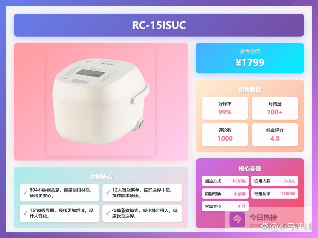 点评:这款东芝电饭煲,用起来还挺顺手的,加热很迅速,米饭蒸得特别香,出饭效果不错。它的IH立体双热源技术,让米粒受热更均匀,吃起来口感更好。不管你喜欢软糯还是略带弹性,都能满足。