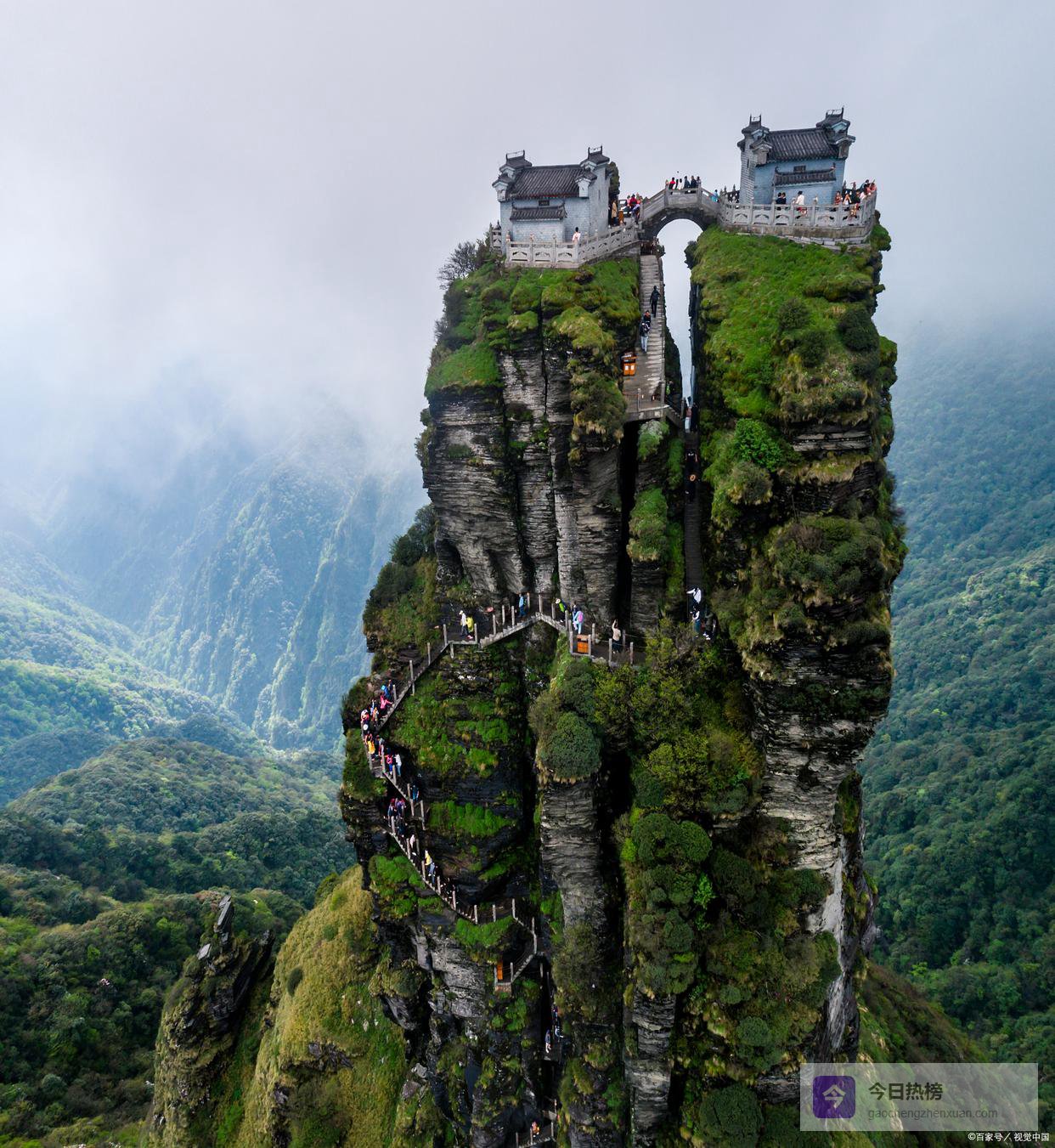 亲测梵净山的名气,配得上它的颜值!2018年就被列入世界自然遗产,作为武陵山脉的主峰,它在大地上突兀升起,像一根直通天际的天柱,气势磅礴。最绝的是山顶的“红云金顶”,被一道裂缝劈成两半,顶上还各建了一座庙,用天桥连着,要爬上去,得手脚并用拽着铁链子,我爬的时候手心全是汗,但登顶那一刻,所有疲惫都烟消云散。云雾起来的时候,站在金顶上看云海翻涌,真的会觉得这不是人间,是神仙开会的地方。而且这里是黔金丝猴唯一的家,这种猴子比大熊猫还稀有,我去了两次才有幸看到一只,能不能偶遇全凭缘分!✅ 6. 松桃红石林——火星同款的红色秘境