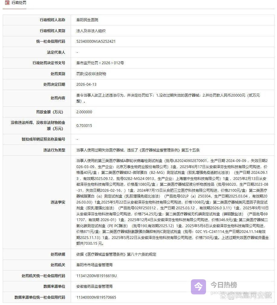 近日,据“信用安徽”公开披露行政处罚信息,因当事人使用过期失效医疗器械,阜阳民生医院被罚款2万元,并没收过期失效的医疗器械。行政处罚决定书文号是阜市监开处罚﹝2026﹞012号。