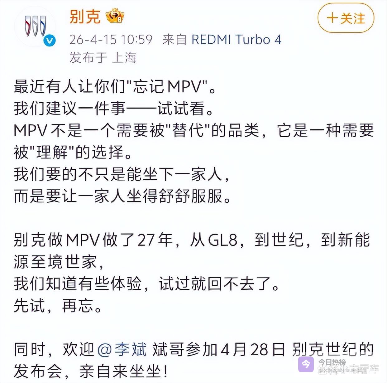 别克直接杀出来了。官微发文,话不多但句句扎心:“最近有人让你们‘忘记MPV’,我们建议一件事——试试看。”还补了一句“有些体验,试过就回不去了”。更绝的是,别克直接向李斌发了邀请函:“欢迎斌哥参加4月28日别克世纪的发布会,亲自来坐坐!”