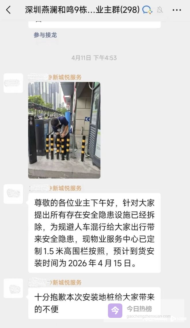 业主提供的微信聊天记录截图显示,4月11日下午,小区物业负责人在9栋业主群留言致歉:“存在安全隐患的设施已经拆除,为规避人车混行给大家出行带来的安全隐患,物业服务中心已定制1.5米高的围栏,预计到货安装时间为2026年4月15日。十分抱歉本次安装地桩给大家带来的不便。”