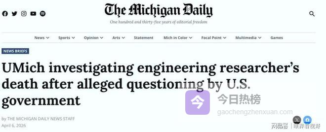 气味是消毒水的刺鼻,数字是 31 岁的年轻生命,冲突是顶刊发文的喜悦与跳楼身亡的悲剧。3 月 20 日,中国博士后汪丹浩在美国密歇根大学坠亡,而就在同一天,他的最新论文刚在顶级期刊《自然·电子学》刊发。本该是学术生涯的高光时刻,却成了生命的终点。日前,外交部发言人证实,汪丹浩在遭美方执法人员约谈盘问后不幸自杀。这不仅是个人悲剧,更是中美学术交流冰封下的极端缩影。