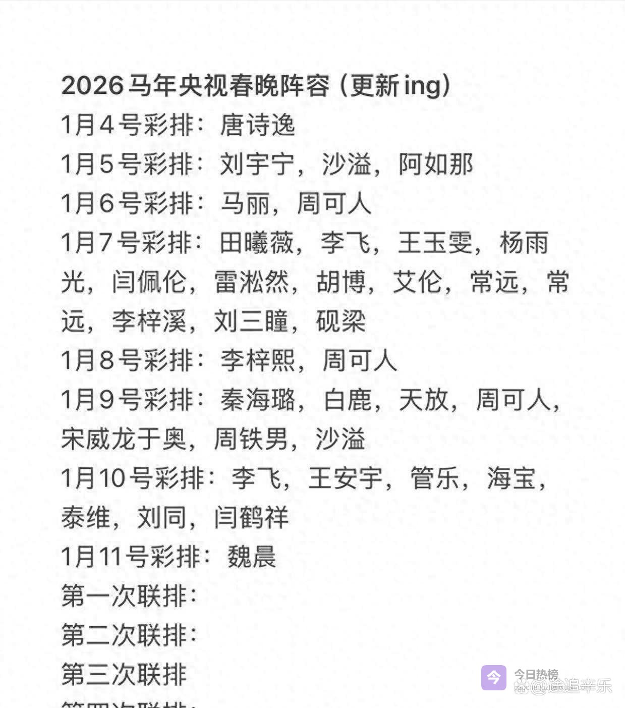 这次排练算是第3遍了1月31日的春晚第三次彩排顺利结束,那天还有不少咱们熟悉的明星到场了。
