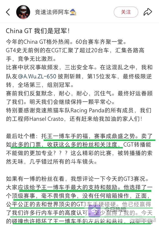 昨天深夜,一条来自GT4 AM组别冠军车手的发文,在赛车圈里悄悄传开了。