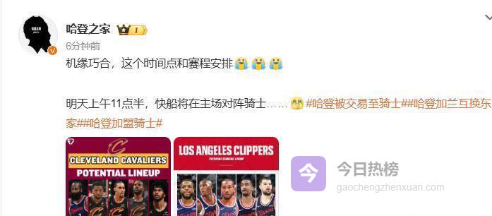 交易完成后,骑士与快船的常规赛对决立刻增添了新的看点。 两队接下来即将正面交锋,哈登可能代表骑士出战对阵老东家的比赛。