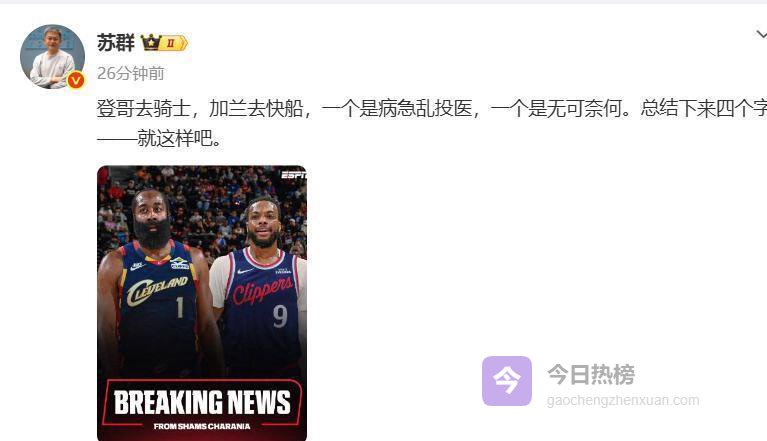 《今日美国》对交易的评价更为鲜明,他们给骑士评A,快船仅得C。 该媒体认为骑士用出勤率难以保障的加兰换来哈登是明智之举。