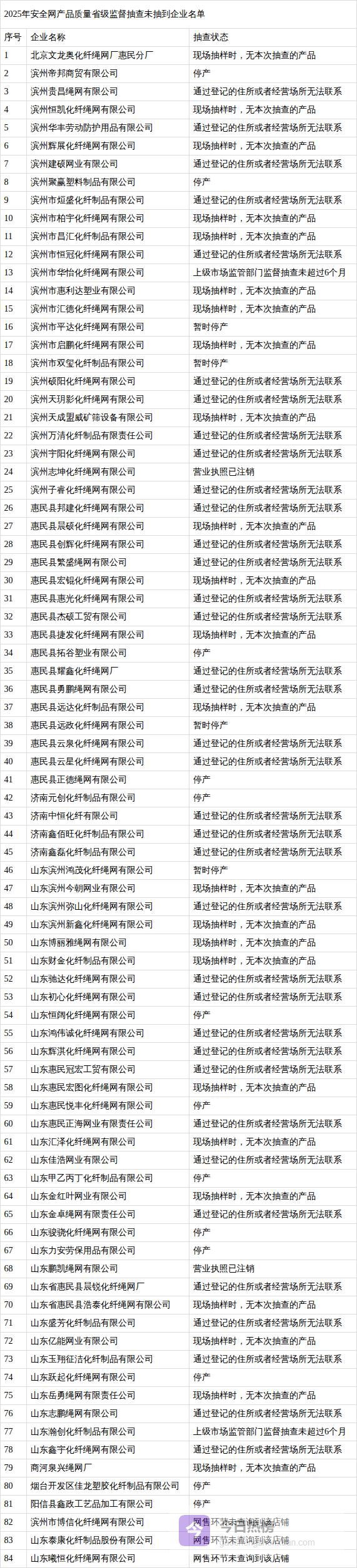 中国质量新闻网讯 近日,山东省市场监督管理局网站公布2025年安全网产品质量省级监督抽查结果。2025年第3批省级监督抽查共抽查安全网产品90批次,其中,生产环节50批次,销售环节20批次,网售环节20批次。