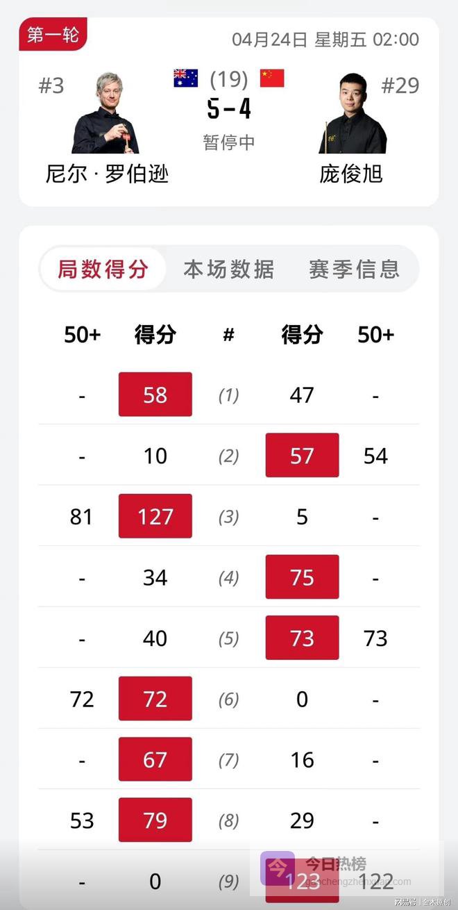 庞俊旭在今晨与罗伯逊的交手中,表现相对就好很多,甚至数据稍好一些,他打出一杆122分破百和54、73两杆50 ,罗伯逊没有破百,只有三杆50 ,最终庞俊旭4-5暂时落后!