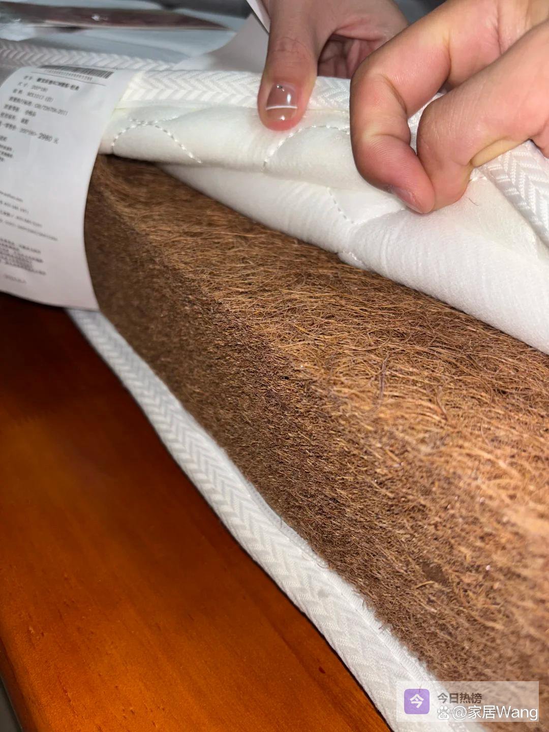 这种床垫子最难使用的材料是椰棕,但是因为加入了大量胶水,会产生刺鼻性的味道,看上去平整,