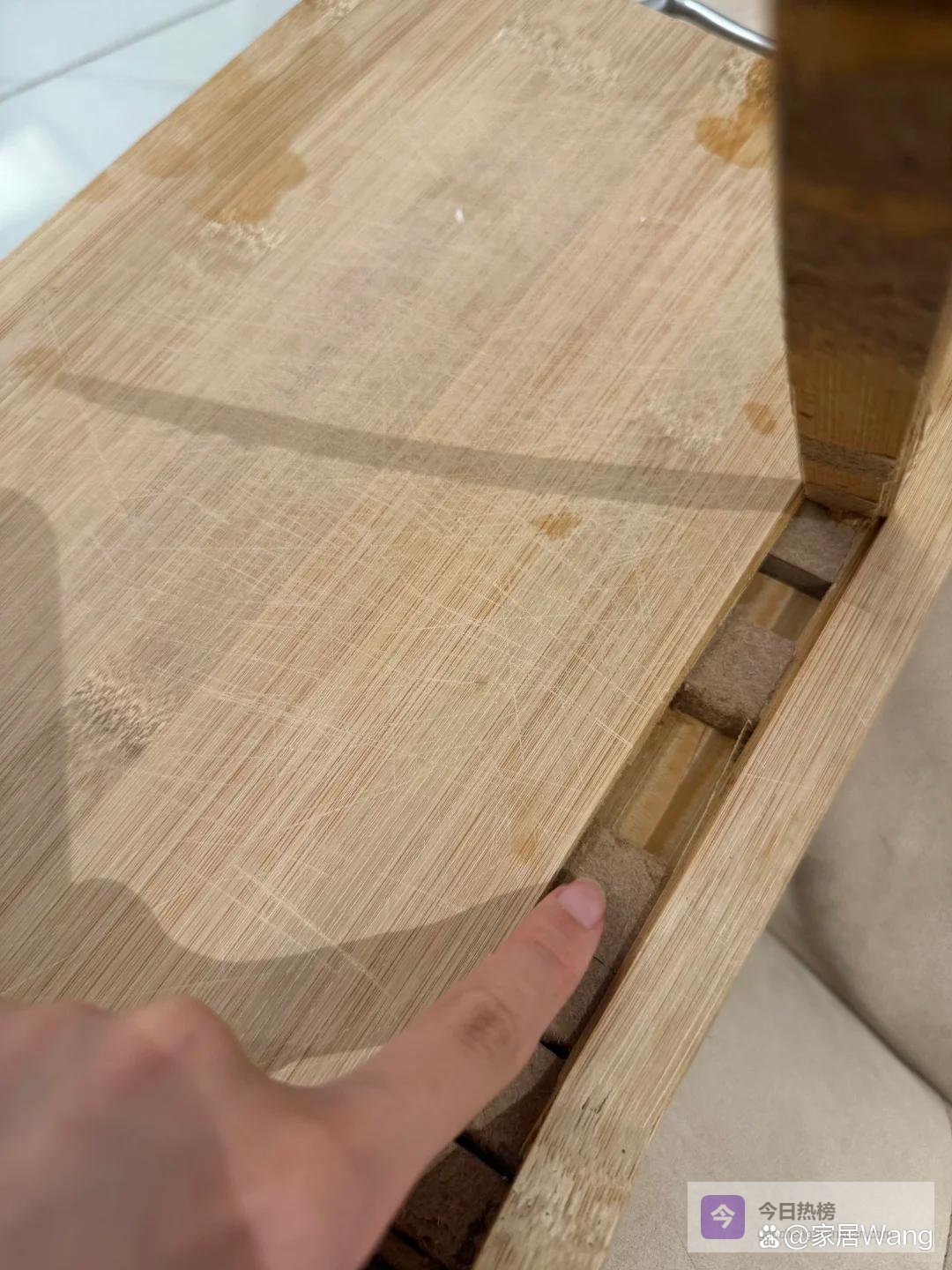 菜板每天都在使用,但是看看你家的菜板是否安全,奉劝大家不要选择拼接的菜板,因为有可能一些廉价的拼接菜板,里面会用到密度板,密度板是木屑、木渣加入胶水合成的,