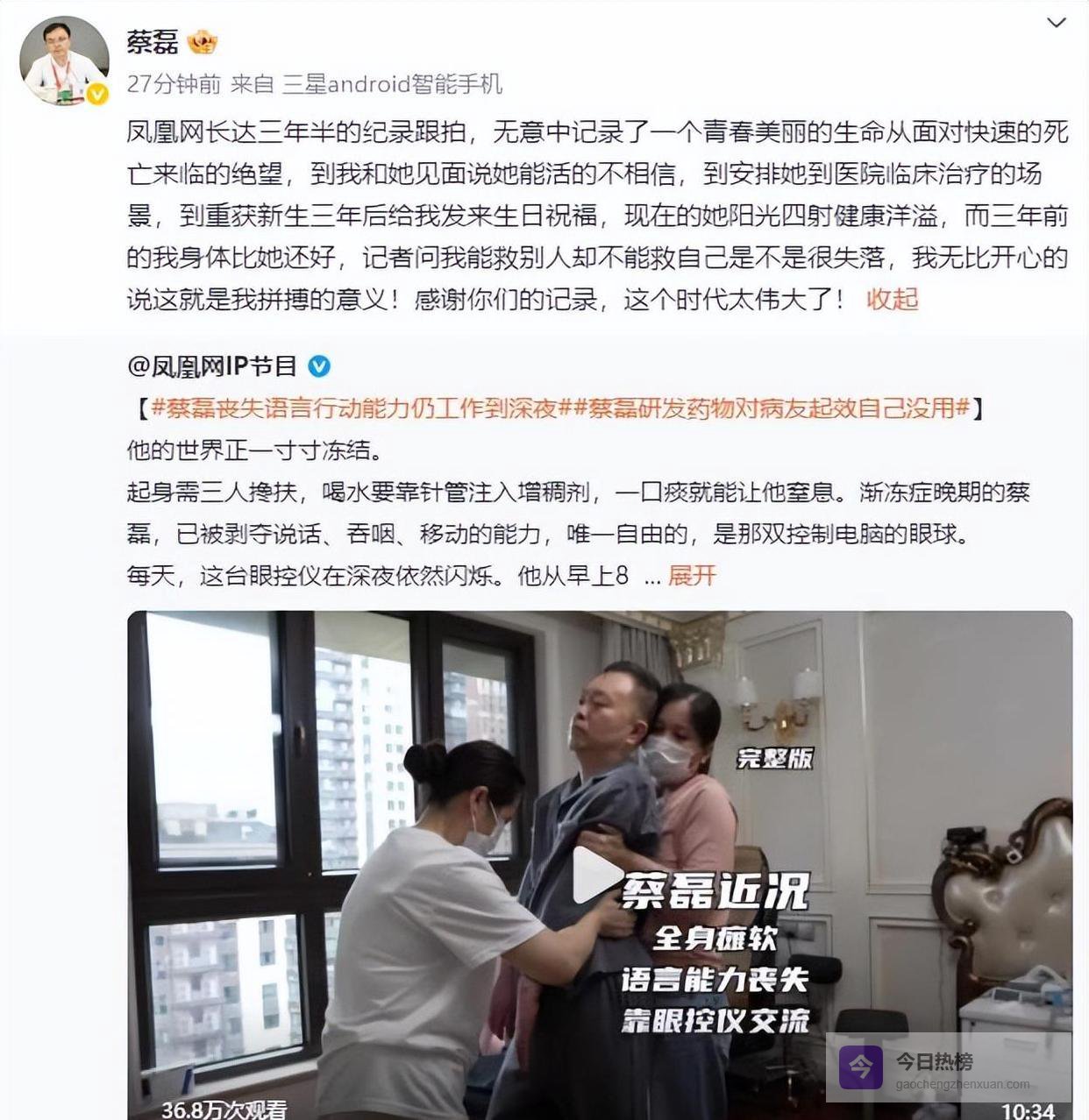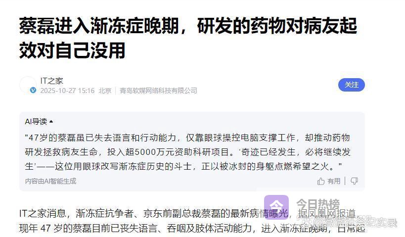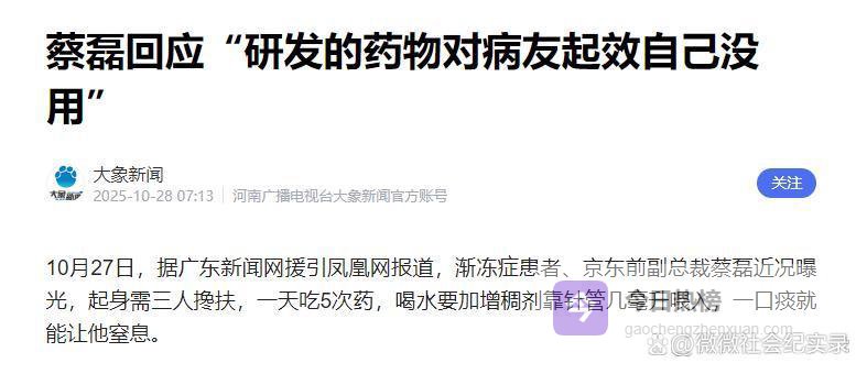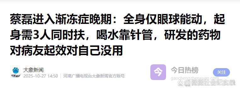 从 9 月底宣告药物研发突破,到 10 月底曝光艰难近况,不到 1 个月的时间里,蔡磊用行动诠释着 “与渐冻症战死” 的决心。他为自己安排的 “后路”,早已超越个人层面,成为推动渐冻症科研与患者救助事业的重要力量。这场与时间的赛跑,他或许无法赢得个人生命的长度,却在拓展着人类对抗绝症的广度与深度。