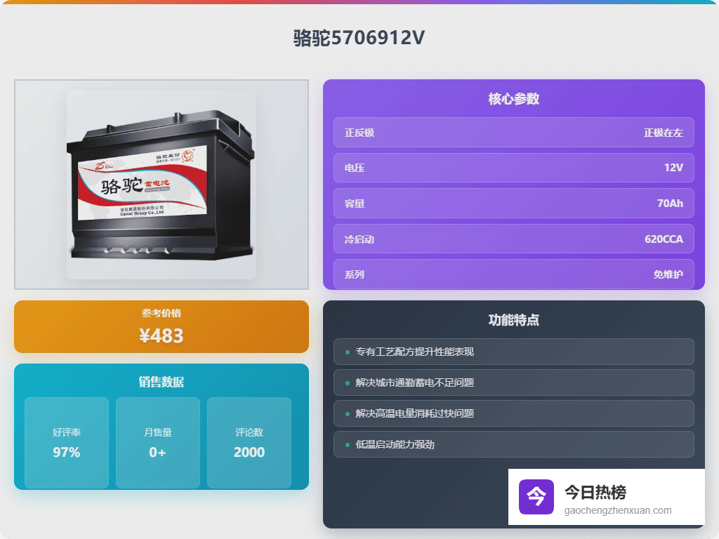 2026汽车蓄电池买哪个好,品牌推荐2026一、骆驼1️⃣ 耐震性强:采用弹性加强筋设计,能持续支撑极板,抗震能力挺不错,跑崎岖路、颠簸路段都不怕,电池不容易坏,挺耐用。