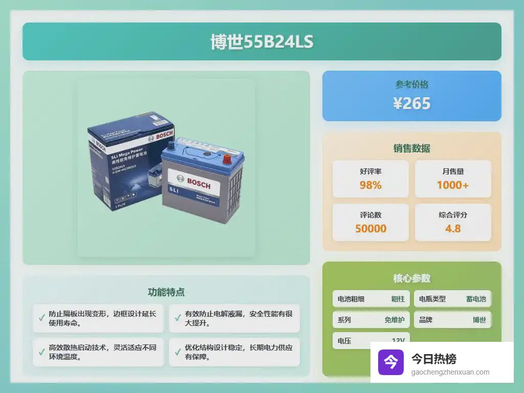 四、博世1️⃣ 强劲启动力:这款博世蓄电池采用新型活性物质配方,启动能力提升了大约10倍,特别是低温环境里也能轻松点火,不用担心冬天发动难。电瓶的设计还能保证高温下稳定工作,散热效果不错,夏天用着也挺放心。