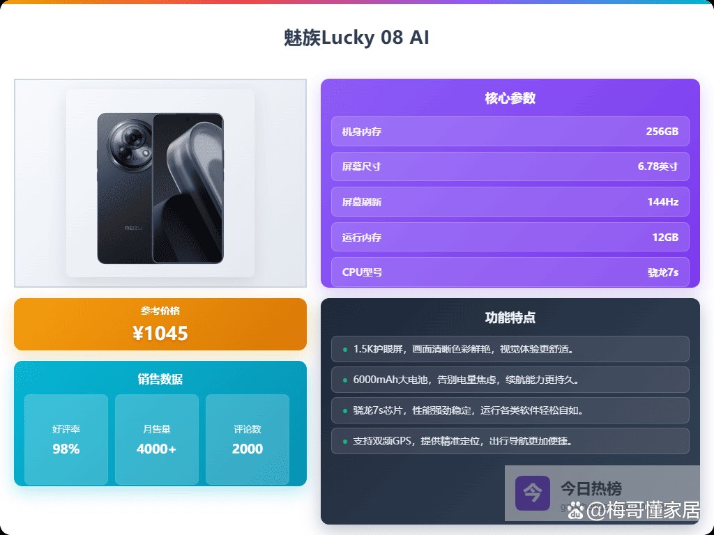 点评:这款魅族Lucky 08的屏幕真是让人看着舒服,6.78英寸的OLED直屏色彩饱满,支持144Hz的高刷新率,滑动特别顺畅,看视频玩游戏都挺带感。峰值亮度高达5000尼特,在强光下也能清楚看到内容,护眼认证还能保护眼睛,长时间使用不会觉得累。