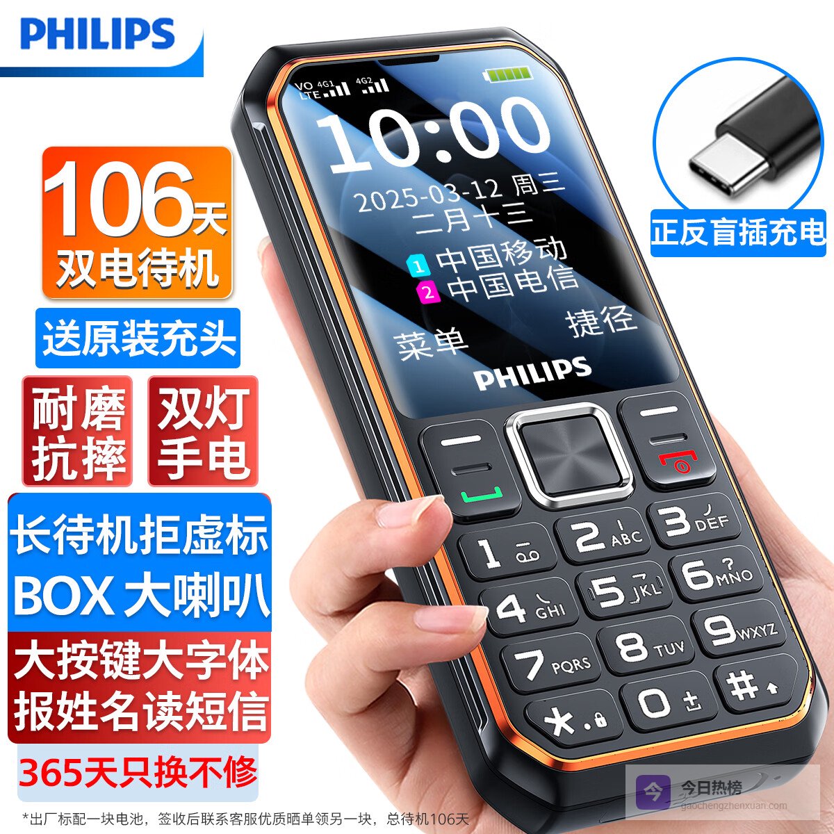 二、飞利浦参数:全语音王、28天超长待机、4G高清通话、浮岛式大按键、生活防水