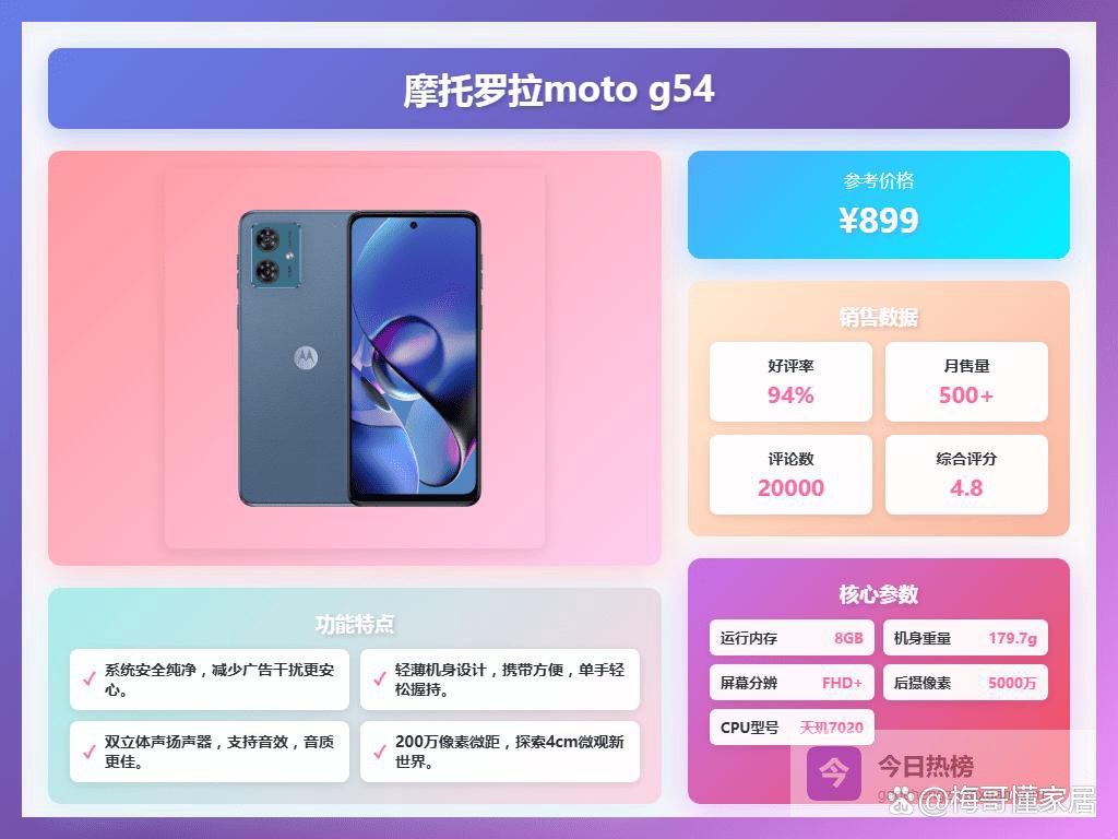 点评:这款摩托罗拉g54搭载天玑7020处理器,日常用起来挺顺畅,不会卡顿,基本满足你刷微博、看视频的需求。8G大内存用来多开几个应用也没问题,操作起来挺流畅。