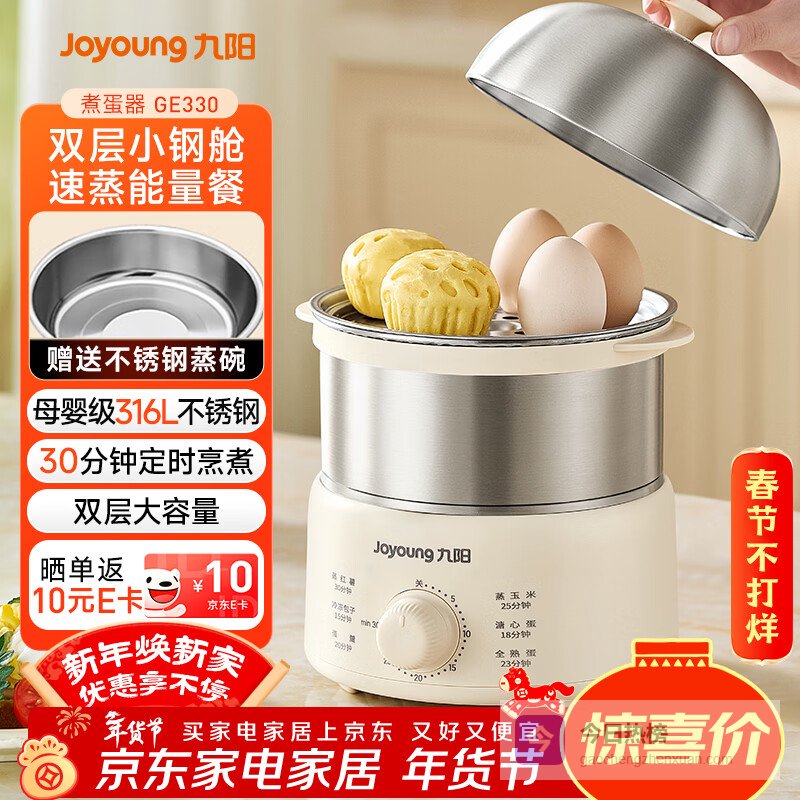 九阳(Joyoung)蒸蛋器 煮蛋器 定时 自动断电安心用 小型316L不锈钢多功能 双层蒸煮鸡蛋早餐神器ZD14-GE330¥
