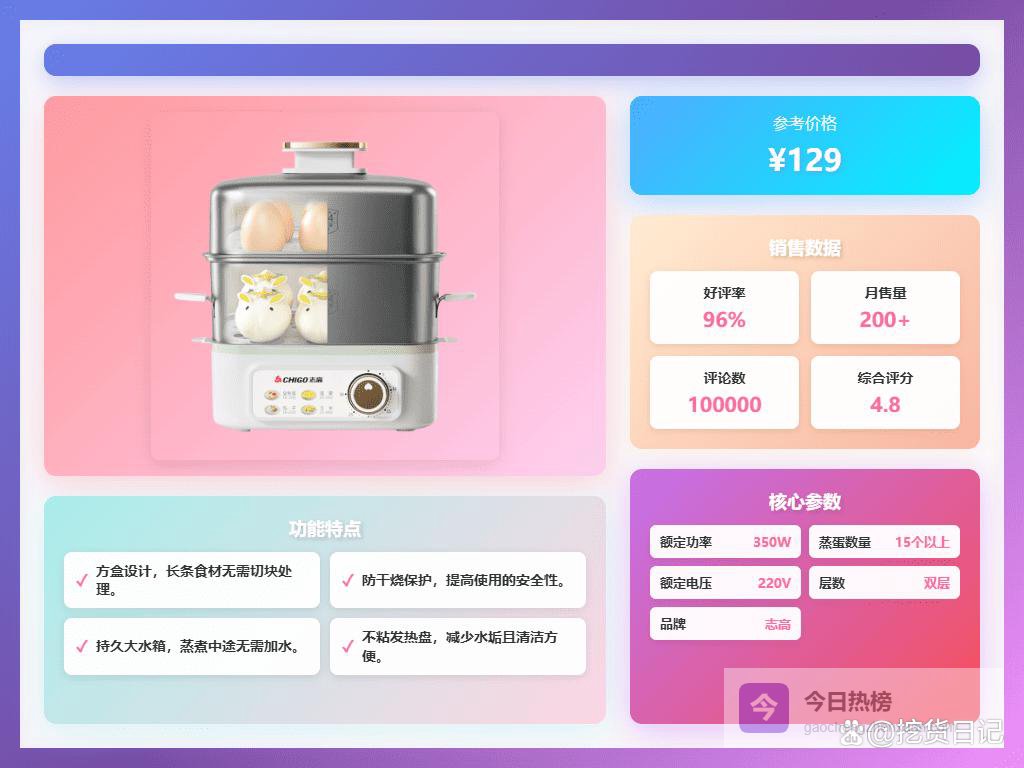 多样蒸煮:不仅能蒸鸡蛋,还能蒸玉米、蒸羹、如意用,几乎啥都能蒸,满足各种家庭不同需求。