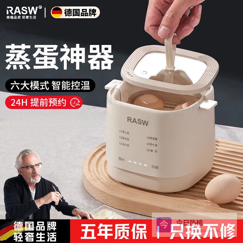 八、RASW六大智能菜单:这款煮蛋器支持溏心蛋、温泉蛋、金沙蛋、蒸蛋羹、茶叶蛋和酸奶等多种烹饪模式,只需按一键就能自动搞定,不用担心火候掌控不好,特别适合忙碌的早晨或懒得折腾的周末。