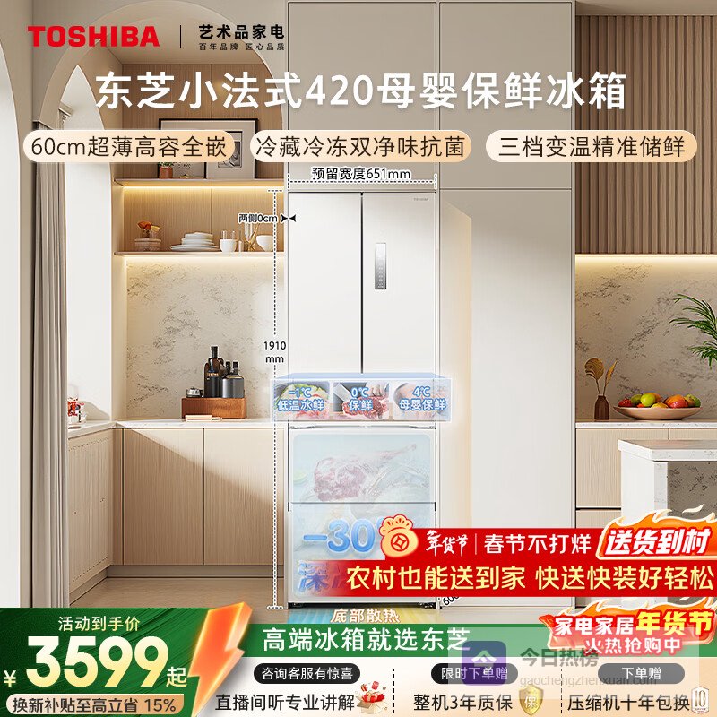 东芝(TOSHIBA)400L法式多门420冰箱超薄嵌入式家用变频出租房节能省电冷藏冷冻保鲜GR-RF420WI-PM171国家补贴¥
