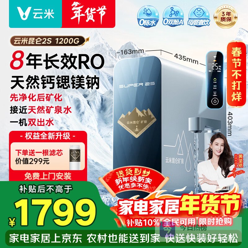【京东自营】云米家用净水机昆仑32S矿泉1200G净水器8年反渗透RO膜双水直饮0阻垢剂厨下式净饮机¥