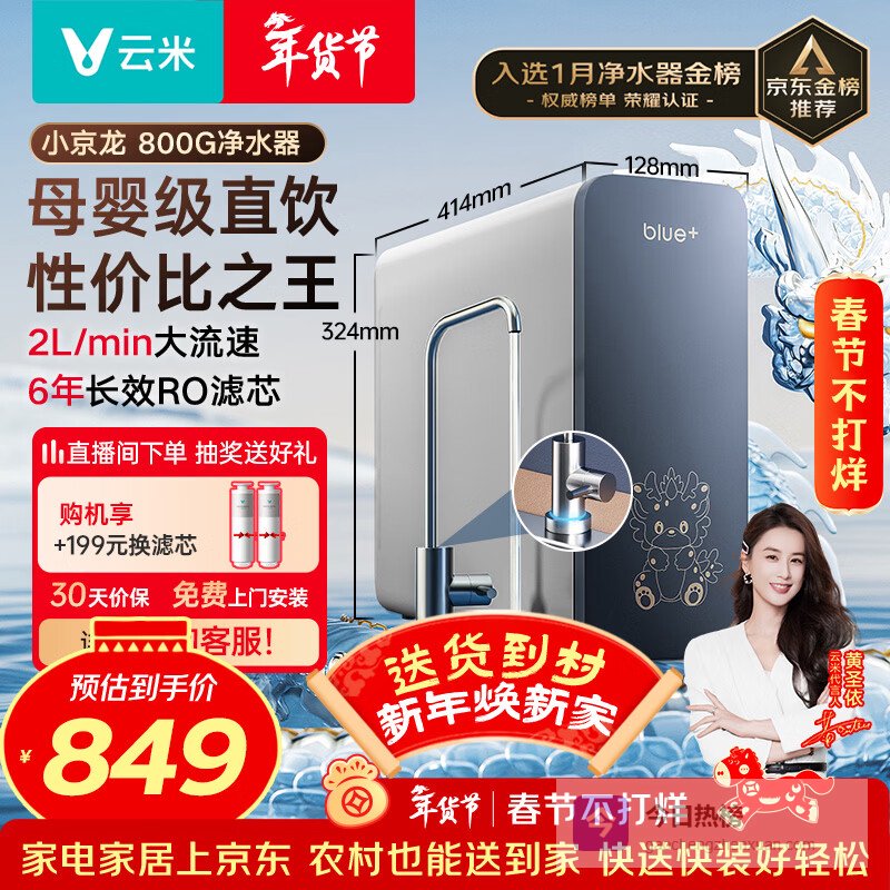 【京东自营】云米小京龙800G厨下净水器6年反渗透RO膜大通量0阻垢剂家用母婴直饮机净水机MR862¥