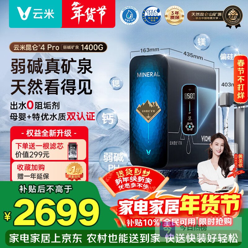 【京东自营】云米家用净水器昆仑4Pro弱碱1400G反渗透厨下净饮机矿物质直饮净水机8年RO膜0阻垢¥