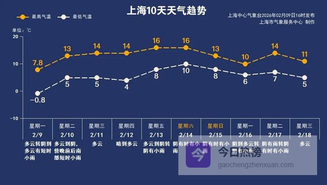 周五开始,受暖湿气流北抬影响,上海的阴雨天气增多。气温略有起伏,总体偏暖,年初二起受冷空气影响,天气转好,气温下降。由于周后期的天气形势将发生调整,预报内容也会出现变动,请大家及时关注最新的天气预报信息,合理安排生活和出行。