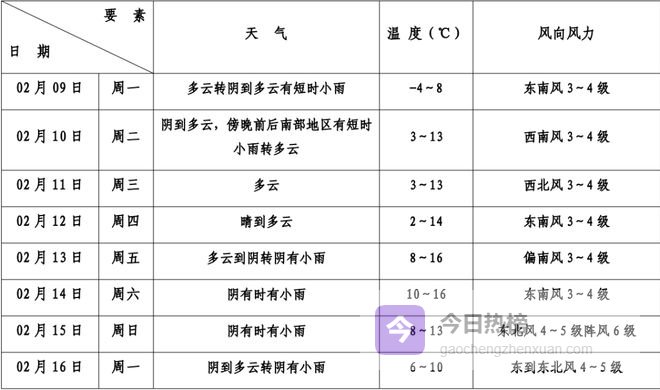 明日具体预报:多云到阴,傍晚前后南部地区短时小雨,西南风3—4级,沿江沿海地区4—5级。气温5—13℃。相对湿度90%—50%。