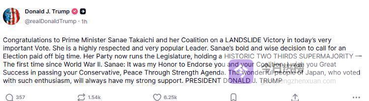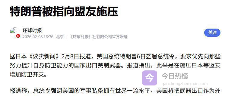 起初,他表现得相当礼貌,表示祝贺高市获得“压倒性胜利”,并称赞她掌控了国会的绝对权力。然而,话音刚落,特朗普便迅速做出反应,签署了一项关于武器出口的总统命令,力度堪称“超级提升”。