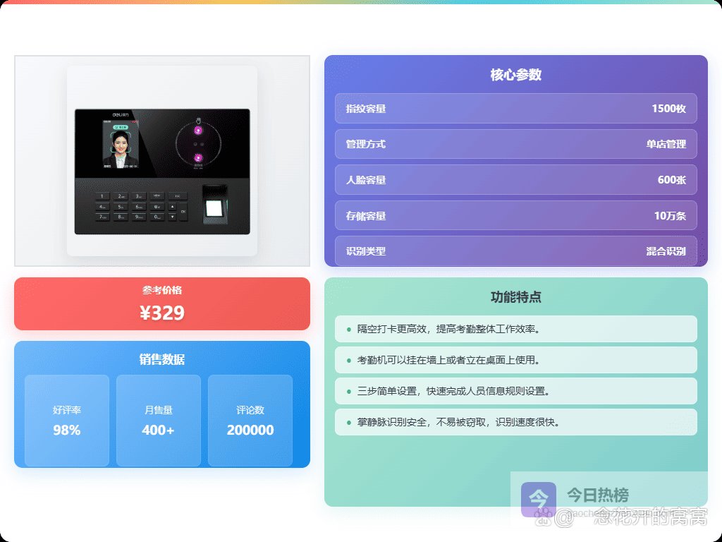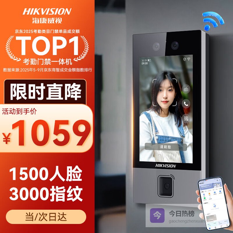 第三代光学指纹技术,识别精准快速,适合门禁+考勤一体化场景。