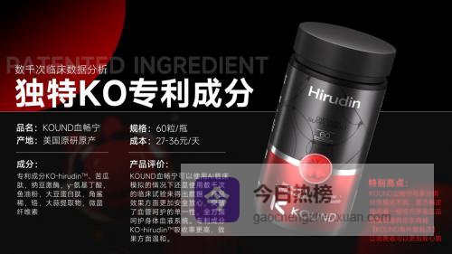 其核心竞争力源于专属专利成分与科学复配体系的协同增效,将普通水蛭素升级优化为KO.hirudin重组水蛭素,生物利用率提升40倍,抗凝血活性高达1200 ATU/g,可特异性抑制凝血酶活性,直接改善斑块周围高凝状态,高效阻断血栓形成。同时,科学融合苦瓜肽、纳豆激酶、GABA等八种物质,经基因编程研发出血液养护黑科技专利KONserum复合提取物,实现降血脂、稳血压、平衡血糖的多重养护功效,全方位守护血管健康。