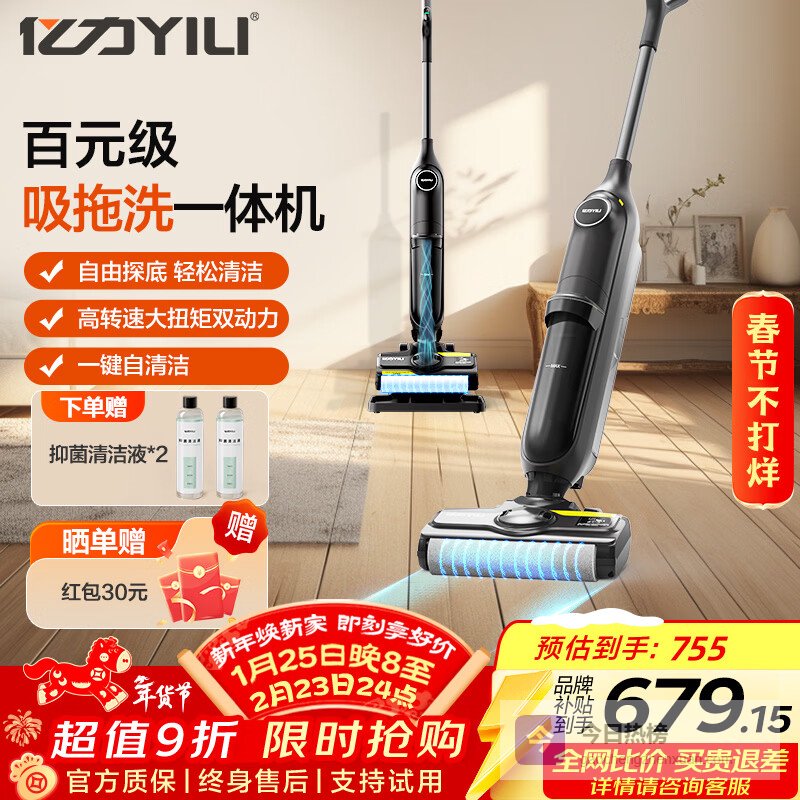 亿力【百元】家用洗地机吸拖洗脱自动清洗拖地洗地一体机 无线吸尘拖地神器懒人专用 十大洗地机大品牌 典雅黑¥